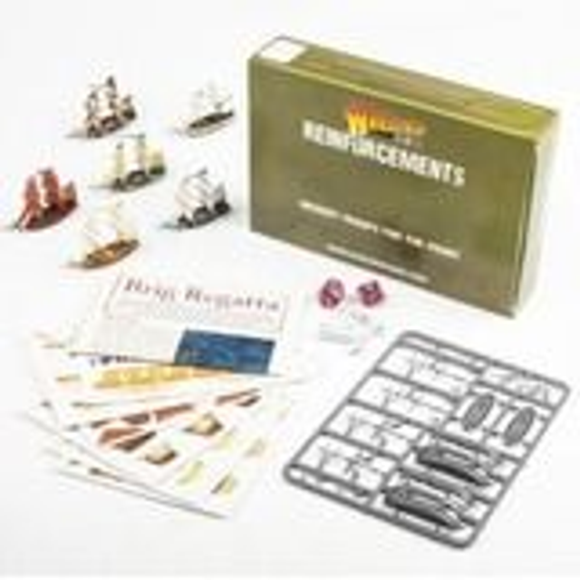 Warlord Games Brig Regatta box set. Contains all the parts you need to build eight 1/700 scale Age of Sail brigs with flag sheets covering the Royal Navy, French Navy, US Navy and Spanish Navy, and a rulebook for the mini game 'Brig Regatta'
